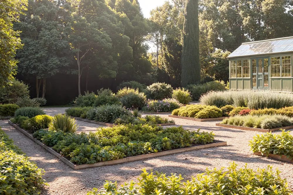 A further step in the transition from the more domestic garden to the natural setting of the site is represented by the vegetable garden and greenhouse area. Here, humbler materials are employed and plants closer to unspoiled nature are used, along with vegetables and aromatic herbs.