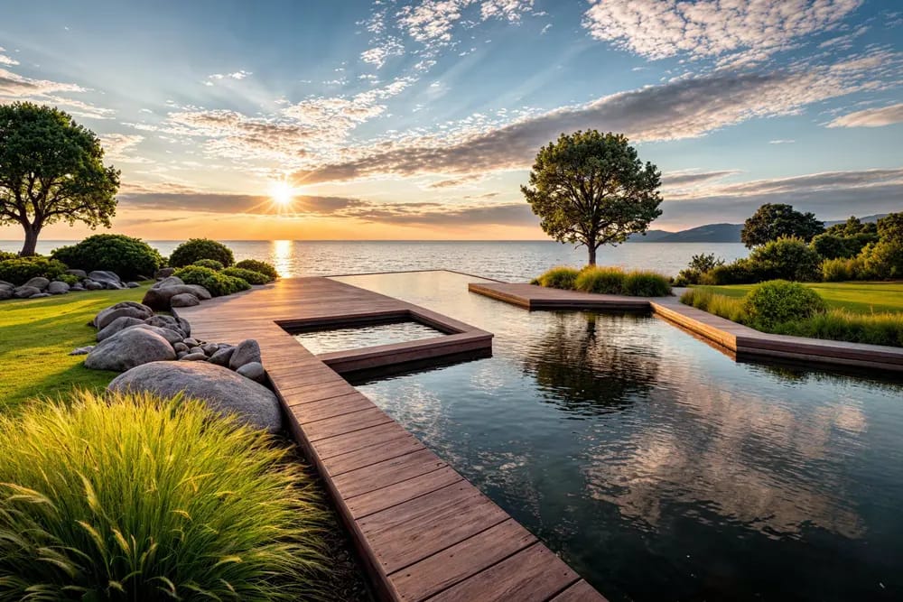 For the natural pool located in front of the sea on a rather rugged, rocky coastline, a natural material such as wood was chosen, blending in well with the surrounding landscape. Large lawn spaces connect areas where shrubs suited to marine exposure have been planted alongside a wide variety of grasses and trees.