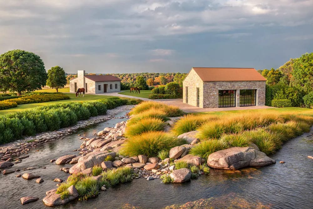 The areas of the estate housing the stables and other buildings used for equestrian activities have been left mostly as meadows, in order to allow the owners’ horses to graze freely.