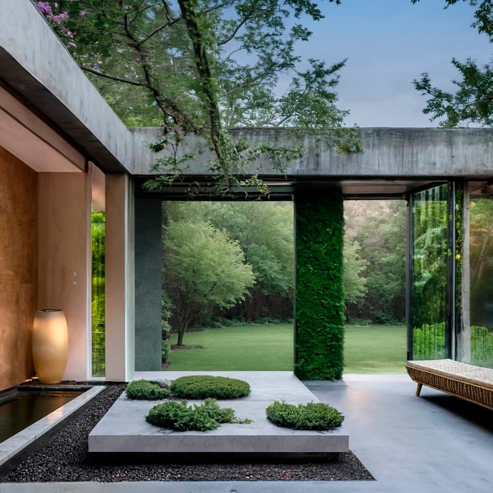 The presence of water, always quiet and to be admired rather than used, underlines the contemplative character of the spaces, which open one after the other in sequence. This sort of small meditative journey ends up into the rear part of the garden that opens onto the surrounding woods. Large grassy spaces underline the transition from the domestic garden, closely connected to the home, to the uncontaminated natural environment.