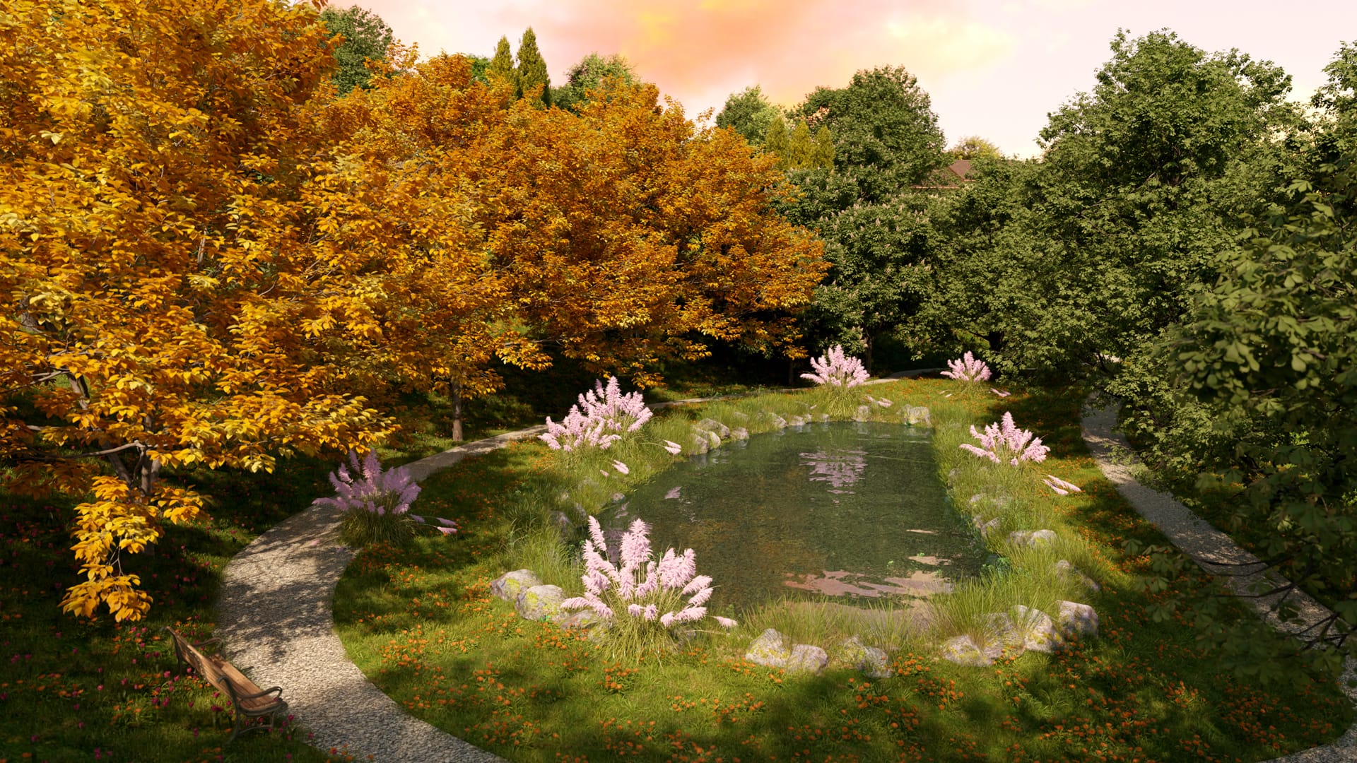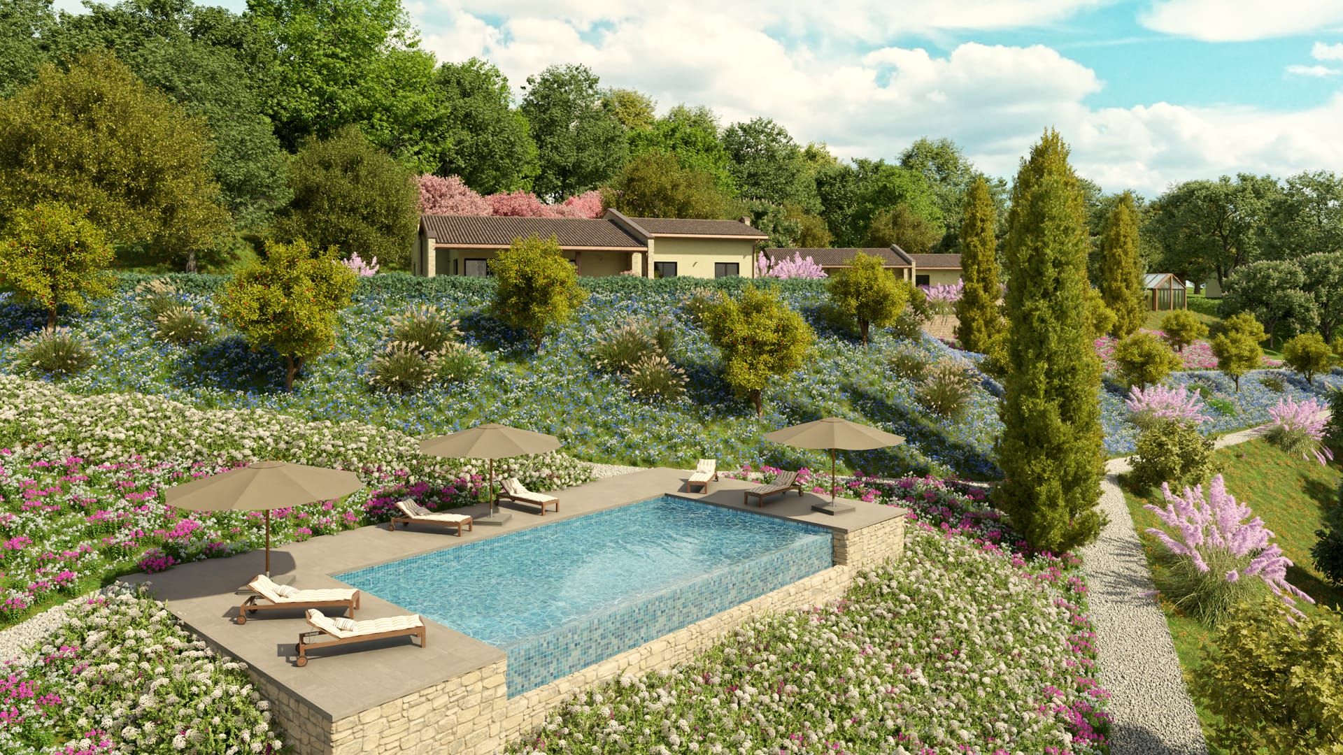 From the swimming pool, as well as from the walkways created along the eastern part of the garden, it will be possible to reach the wood and lake created in the lower part of the property on an area of approximately 3,000 mq. The planted trees will define a large grassed area of about 1,000 mq with paths and seats in which to stop under the shade of the large canopies.