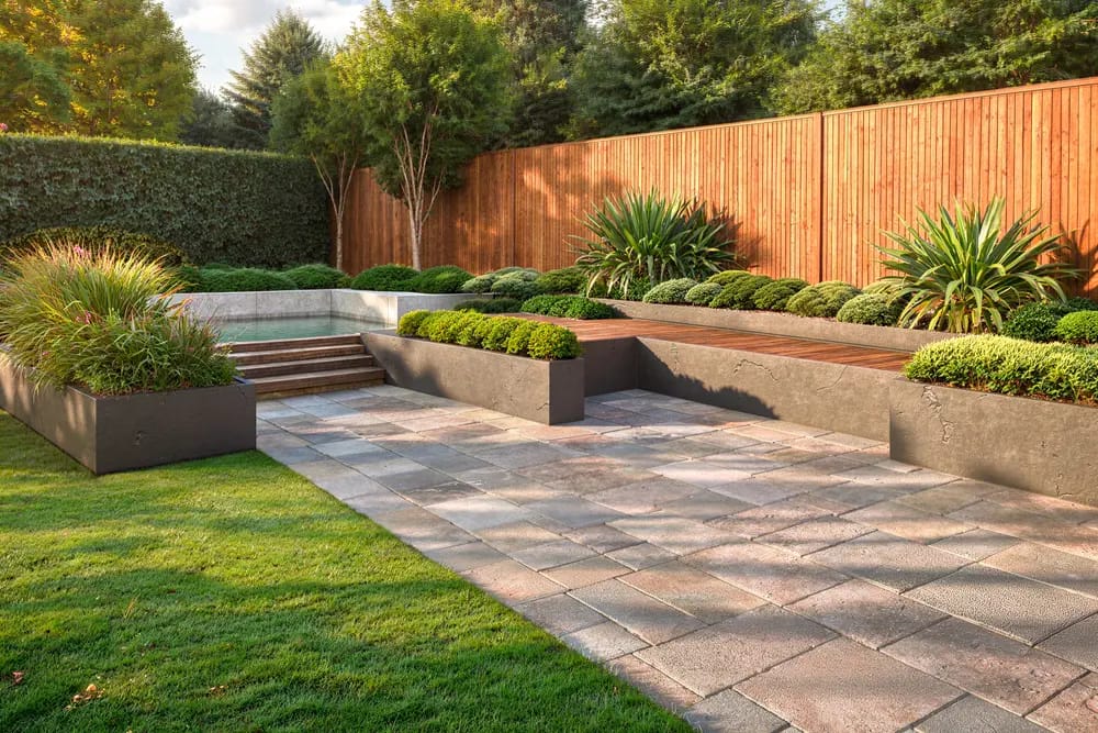 L’impiego del legno e della pietra per le superfici che delimitano il giardino, materiali di pregio dal carattere decisamente naturale, permette di sfruttare un limite intrinseco dello spazio a disposizione (ovvero la chiusura su tutti i lati ed i marcati dislivelli del terreno) per dare maggiore valore estetico agli ambienti.