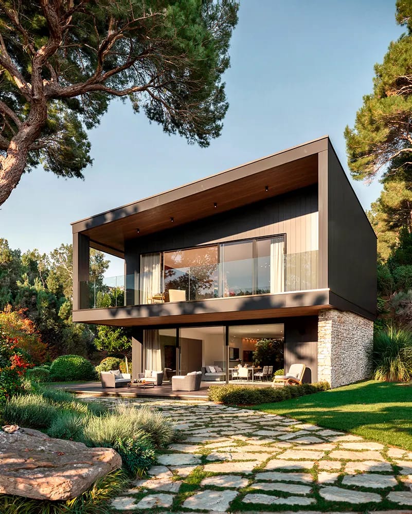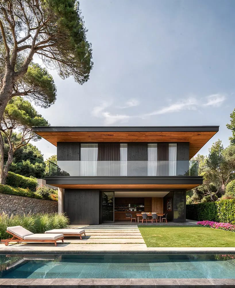 Il giardino di questa villa moderna è inserito in un’area residenziale esclusiva all’interno di un paesaggio spiccatamente mediterraneo, caratterizzato dalla presenza di pregevoli esemplari di pino domestico ad altre alberature tipiche dell’ambiente costiero.