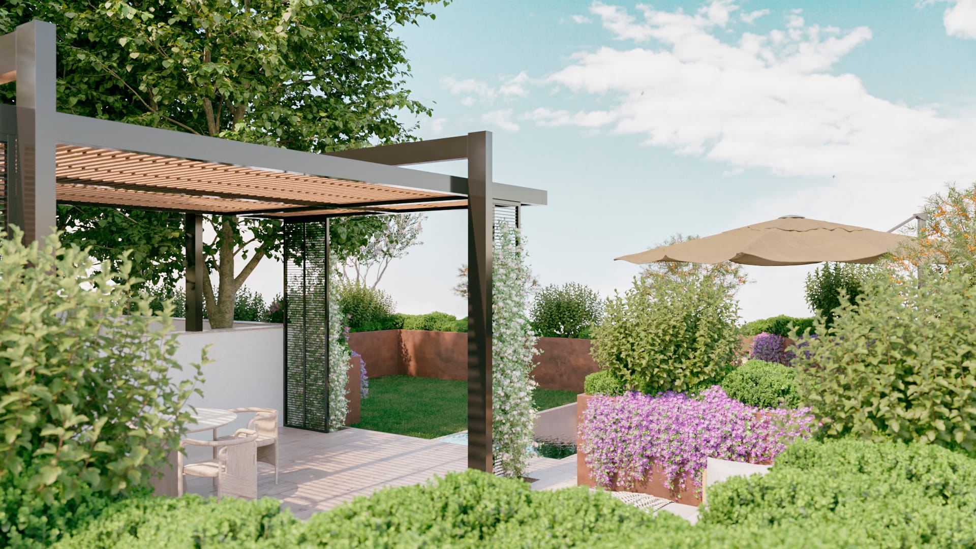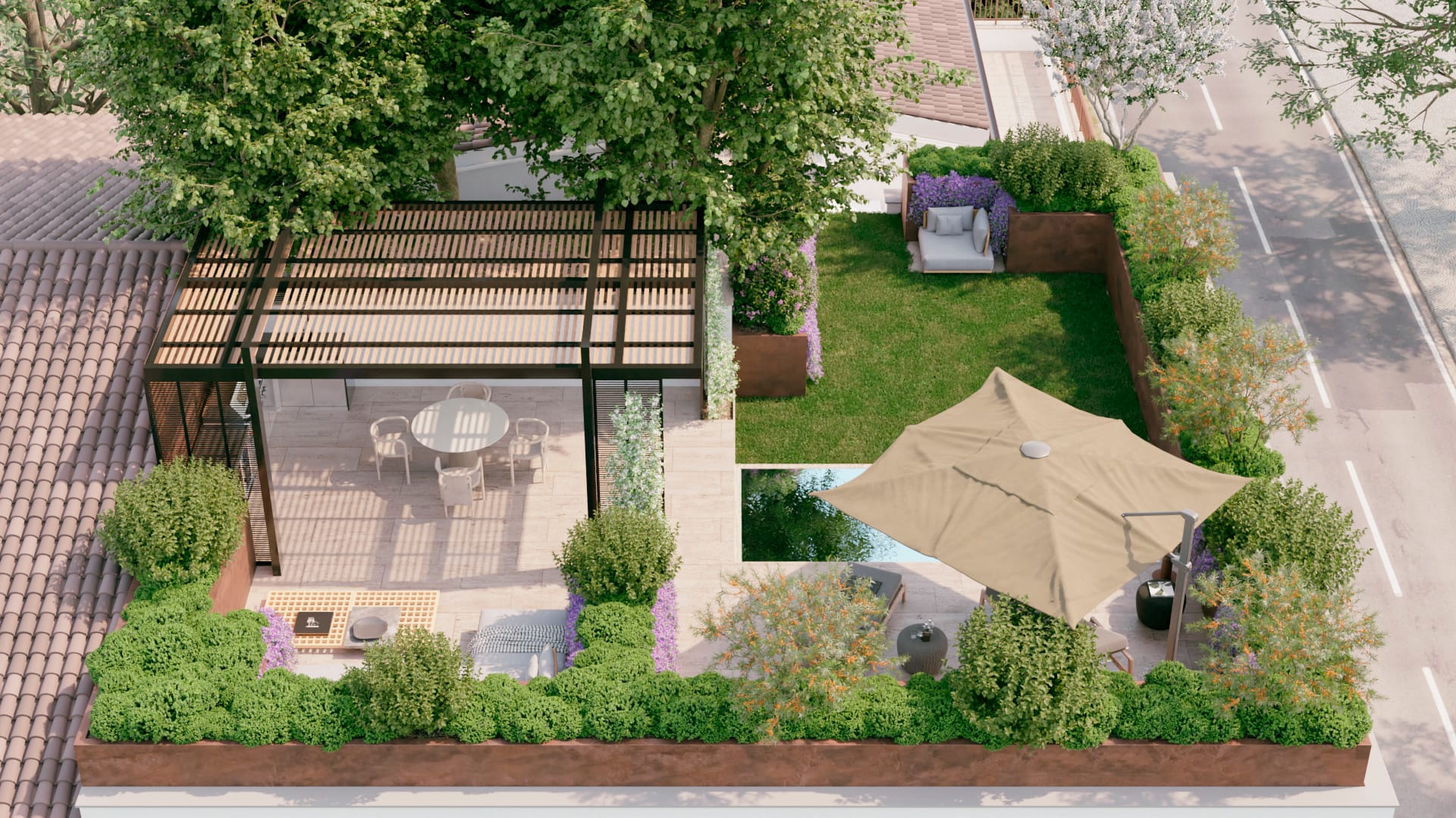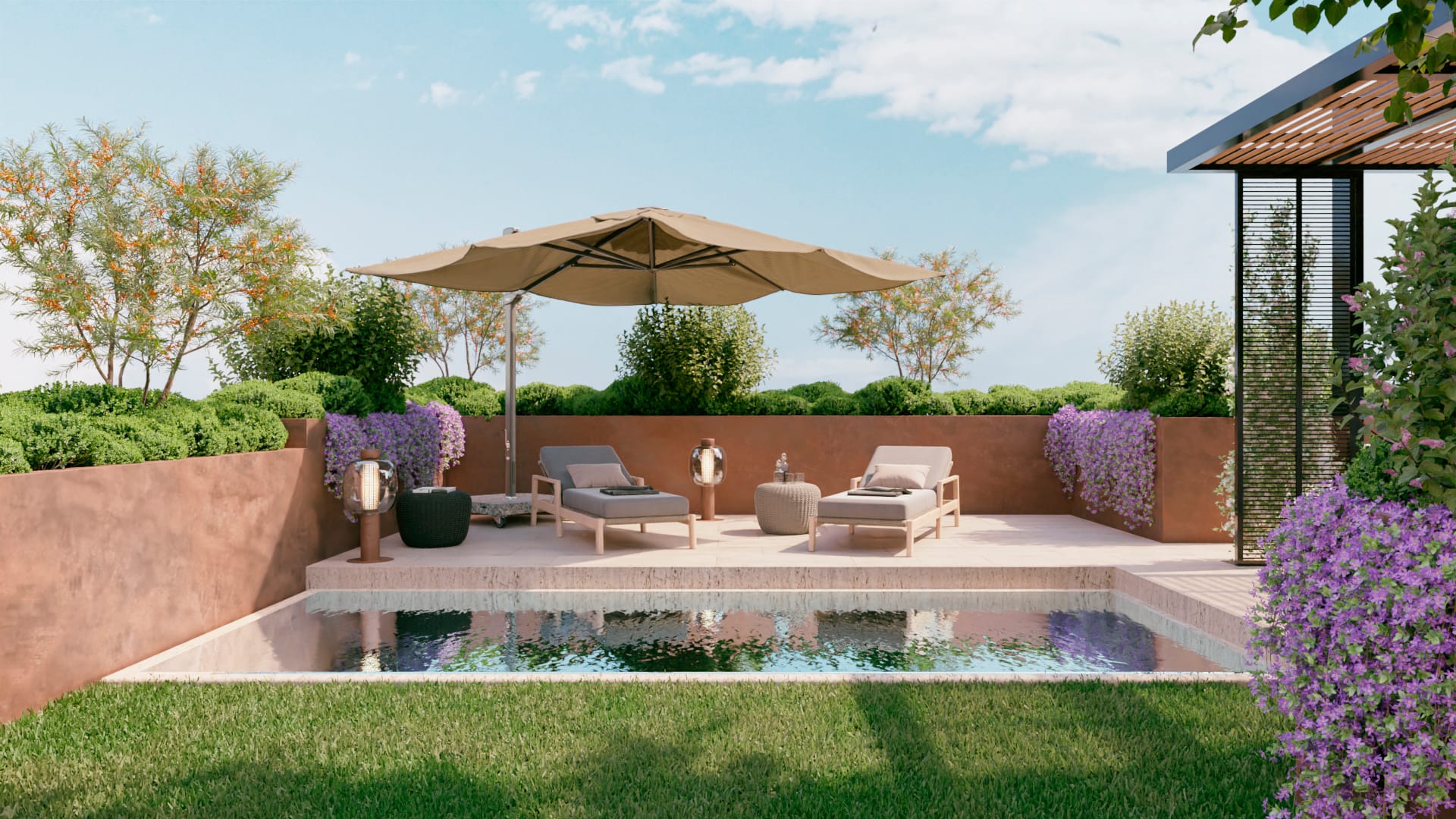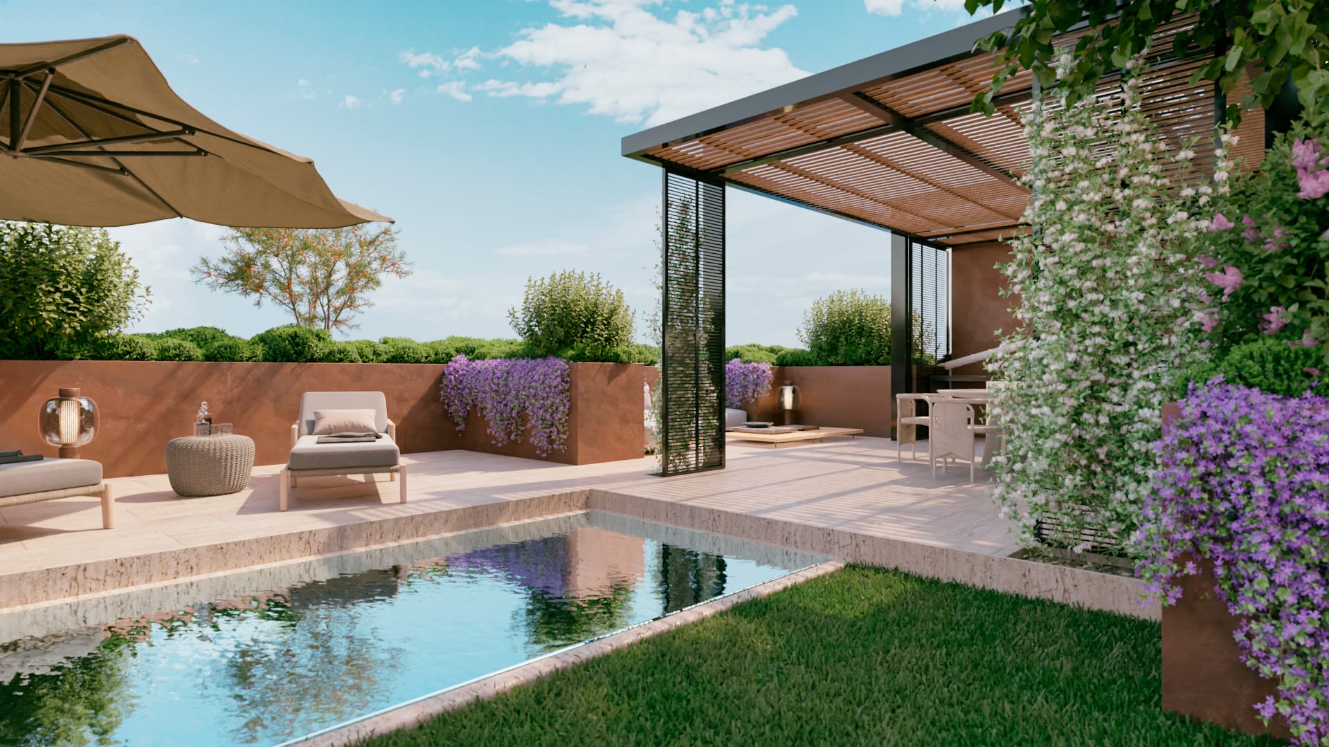 Di fronte al pergolato, verso sud, viene creata una piccola area conviviale con divanetti e sedute. Vicino ad essi, ma schermati da una quinta vegetale che delimita gli ambienti aventi una diversa funzione d’uso, potranno trovare spazio lettini ed un ombrellone per godere del sole estivo di fronte alla mini-piscina.