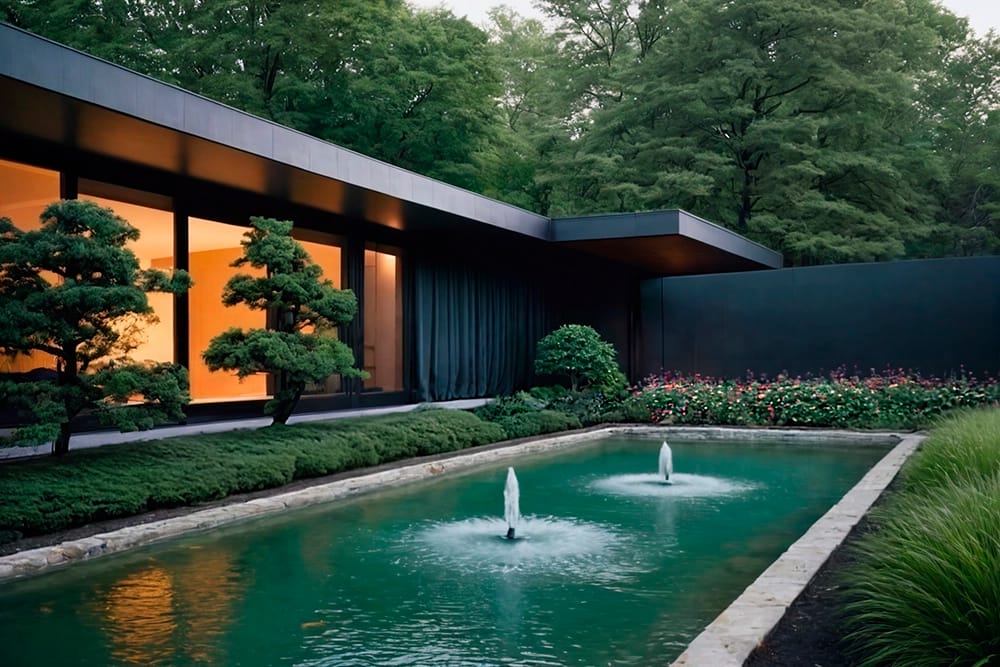 La presenza dell’acqua, declinata come bio-piscina o fontana, va a rimarcare la freschezza dell’ambiente naturale, mettendo in risalto la connessione del giardino con i boschi che lo circondano.