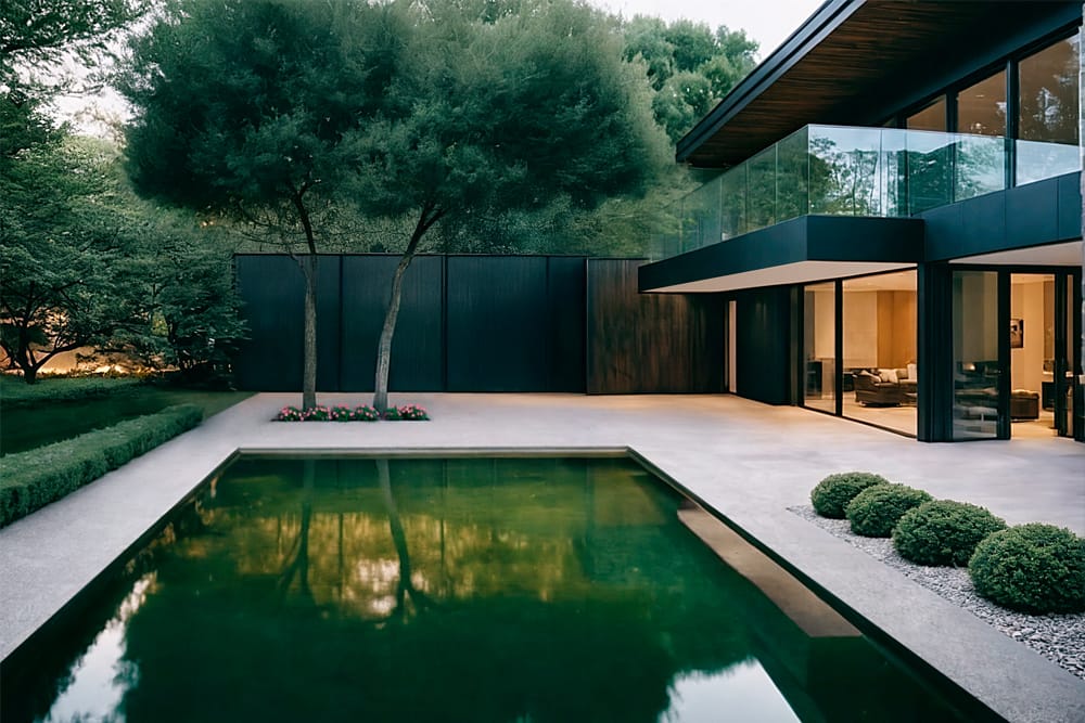 La villa padronale richiama nello stile l’architettura modernista nord-americana, per cui si è seguita un’impostazione analoga per il giardino, costituito da aree dal disegno geometrico e scevro di orpelli.