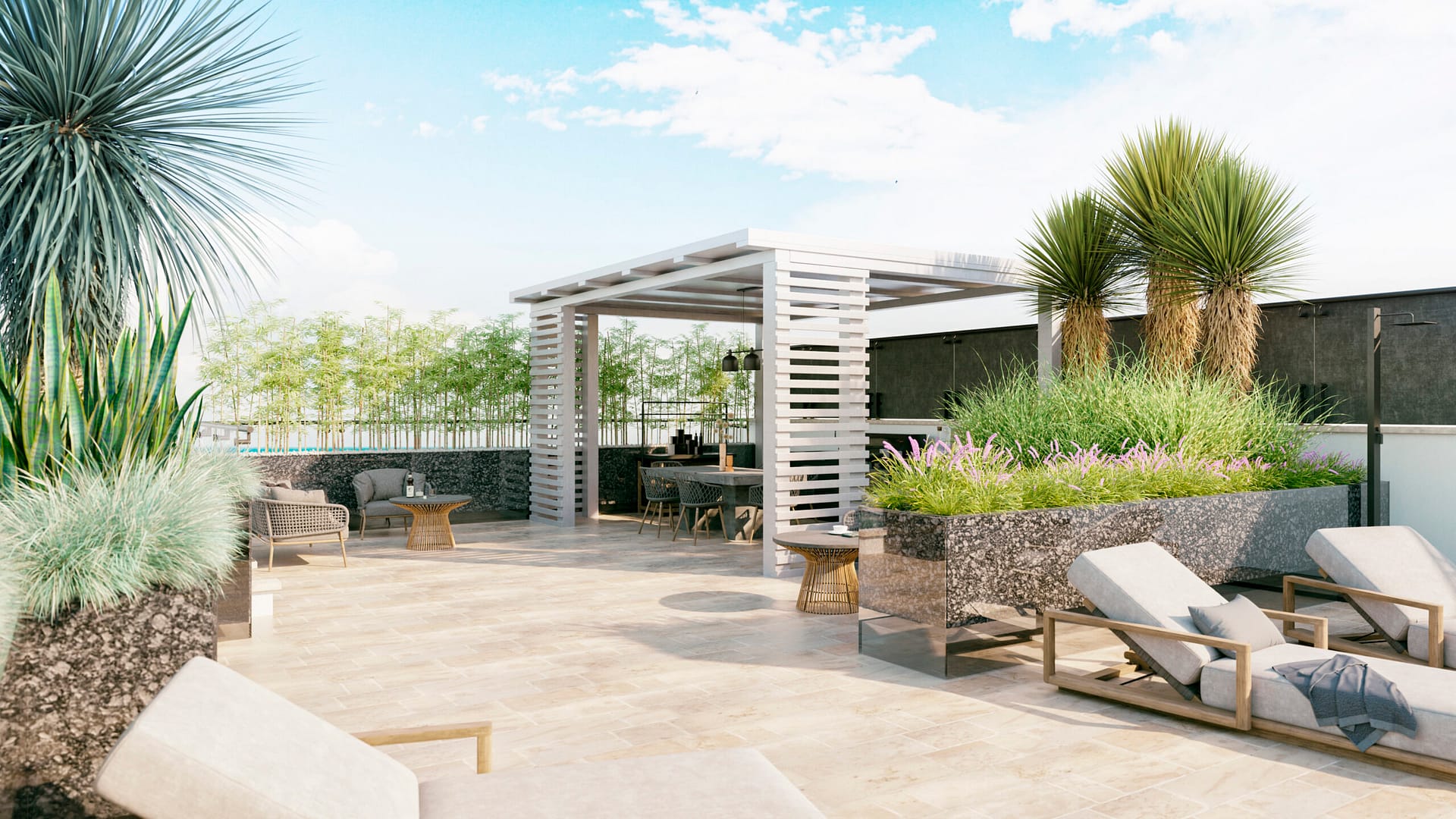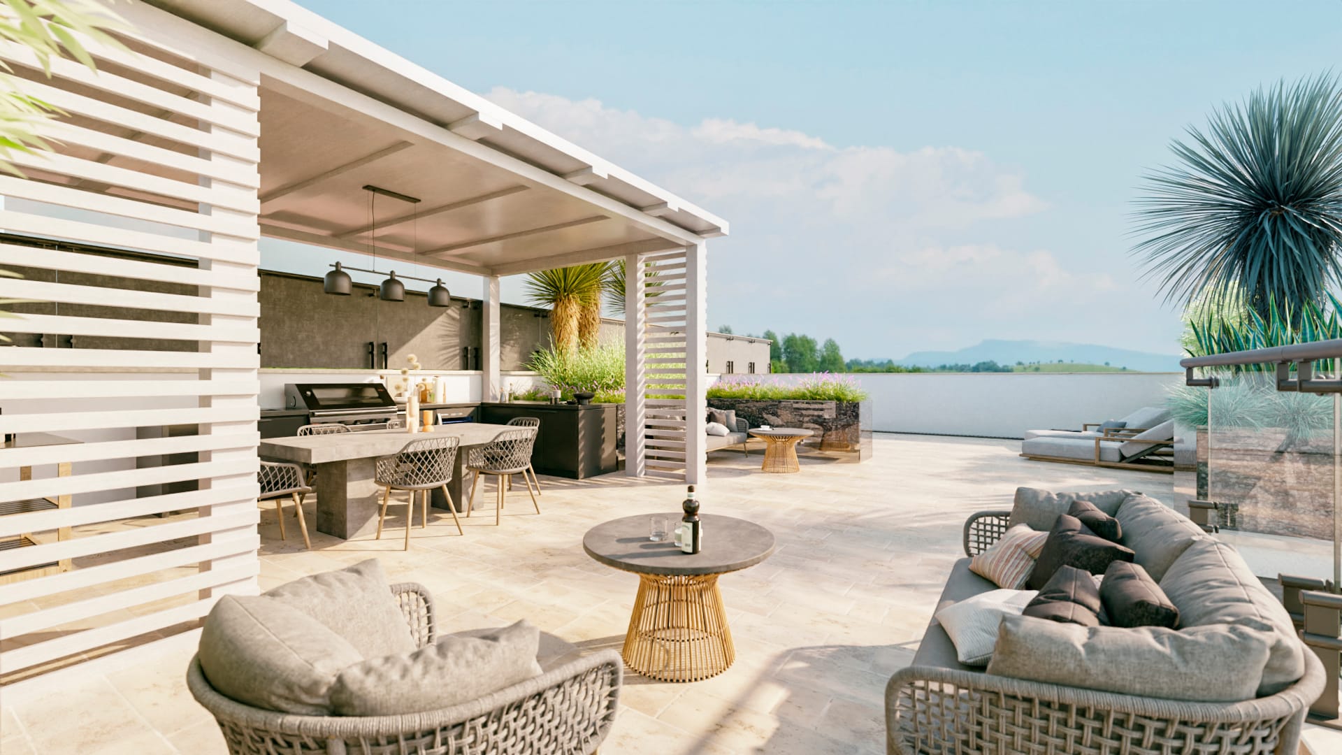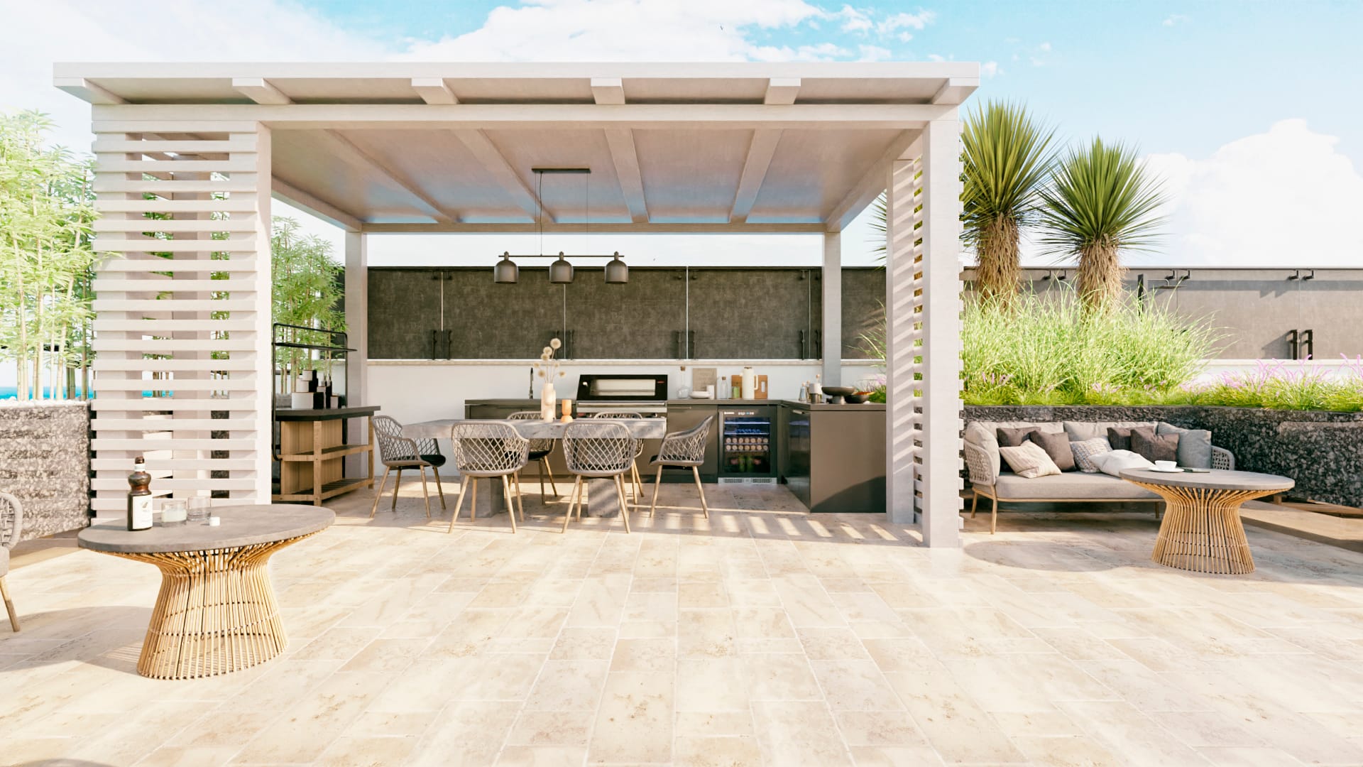 Prevedere l’installazione di un pergolato per pasti all’aperto, dotato di una cucina per esterni, di aree relax e di una piscina.