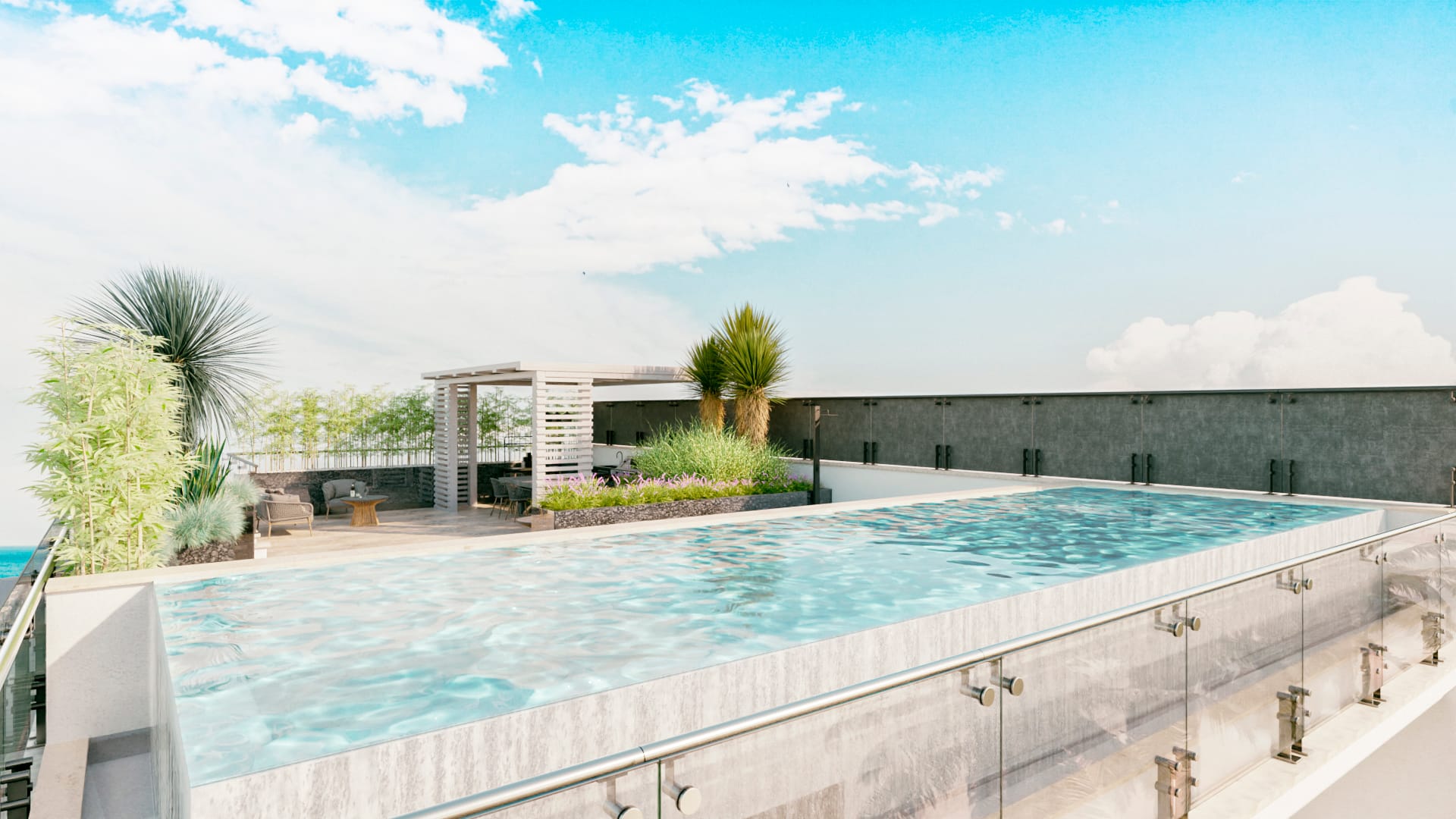 La seconda area del terrazzo vede la presenza di una infinity pool di 8 m x 4 m, rialzata rispetto al solaio per motivi costruttivi e per valorizzare l’effetto dello sfioro verso l’orizzonte, e collocata in una posizione più soleggiata con esposizione a sud-ovest. Qui possono trovare spazio vari lettini e la doccia dedicati alla piscina.