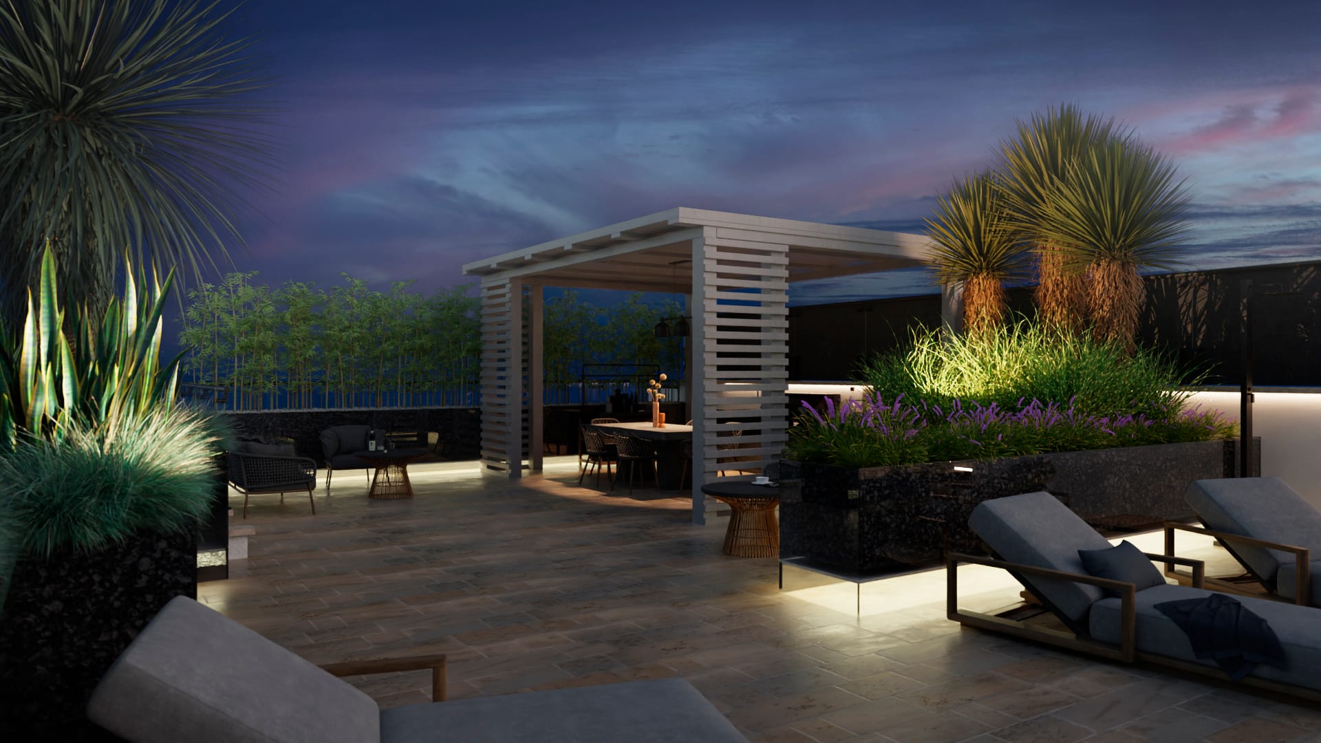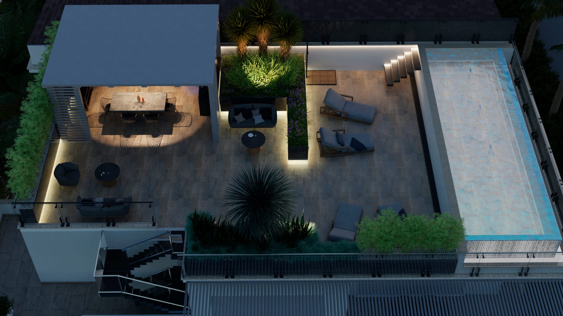 Le vasche che ospitano gli elementi vegetali e disegnano le varie aree del terrazzo sono costruite su misura in materiale trasparente: un’illuminazione a led posta all’interno della base delle vasche permette di creare un diffuso chiarore notturno senza alterare l’atmosfera dello spazio en plein air.